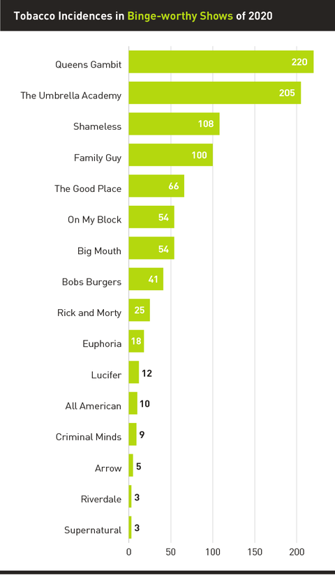 - Despite a prior pledge to limit tobacco depictions in its offerings, Netflix was the top offender based on its new 2020 season releases and popular binge-worthy shows, like “The Umbrella Academy” and “The Queen’s Gambit,” which included tobacco in every episode.
