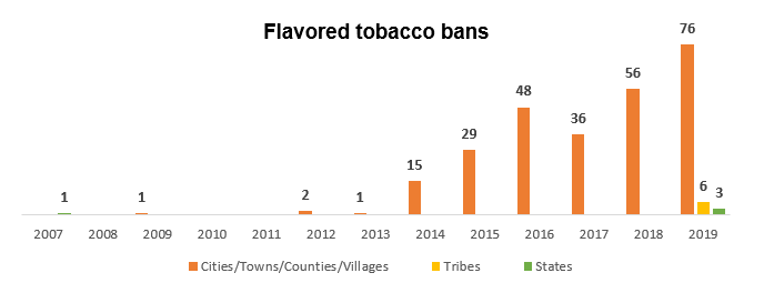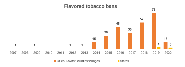 Flavors are also playing a big role in the youth e-cigarette public health crisis — 97% of youth who vape use flavored products — and while the US Food and Drug Administration did issue a policy in January 2020, we believe the policy is deficient and leaves many loopholes. Menthol in all e-cigarette forms and flavors in open-system and disposable products can still remain on the market. Thus, we do not include it here. As a result, implementing strong, local flavor policies that restrict the sale of all flavored tobacco products, including menthol, is an increasingly important tool in ensuring effective tobacco control efforts and protection of the most vulnerable populations.