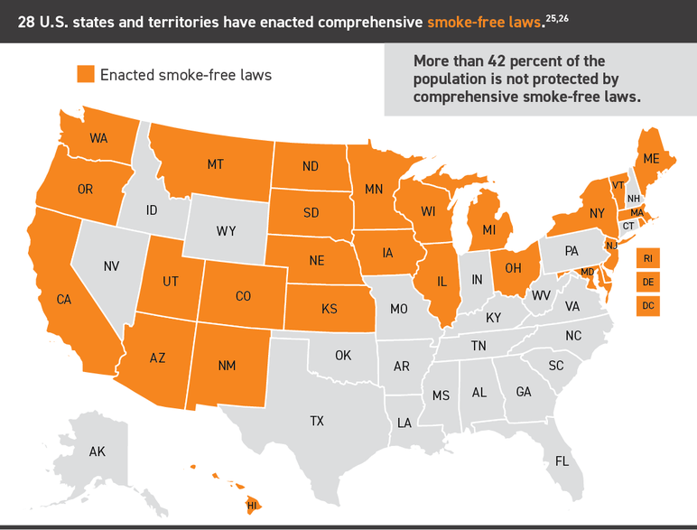 - Although 28 states plus D.C., Puerto Rico, and the Virgin Islands have enacted comprehensive smoke-free laws, disparities exist due to gaps in coverage, particularly in southern states and in places where state laws pre-empt local smoking restrictions.