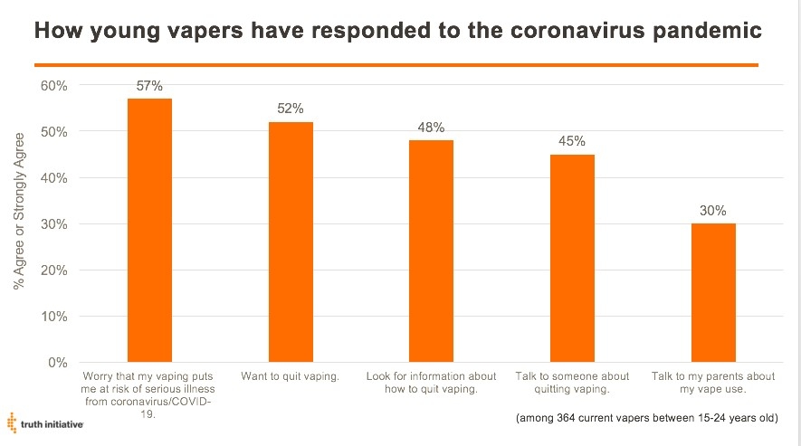 More than half – 52% – of current young vapers surveyed say that the public health crisis has caused them to want to quit vaping and nearly half responded that the pandemic has prompted them to look for information about quitting or talk to someone about quitting.