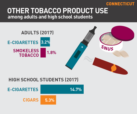 - In 2017, 14.7% of high school students in Connecticut used e-cigarettes on at least one day in the past 30 days.4