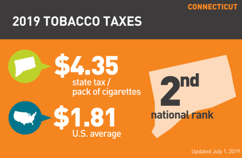 - Connecticut is ranked 2nd in the U.S. for its cigarette tax of $4.35 per pack (enacted December 2017), compared with the national average of $1.81. (The District of Columbia has the highest tax at $4.50 and Missouri has the lowest at 17 cents.) 7,8