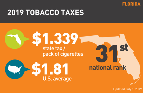 - Florida is ranked 31st in the U.S. for its cigarette tax of $1.339 per pack (enacted July 2009), compared to the national average of $1.81. (The District of Columbia has the highest tax at $4.50 and Missouri has the lowest at 17 cents.) 7-9