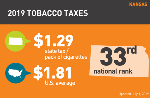 - Kansas is ranked 33rd in the U.S. for its cigarette tax of $1.29 per pack (enacted July 2015), compared with the national average of $1.81. (The District of Columbia has the highest tax at $4.50 and Missouri has the lowest at 17 cents.) 6-8