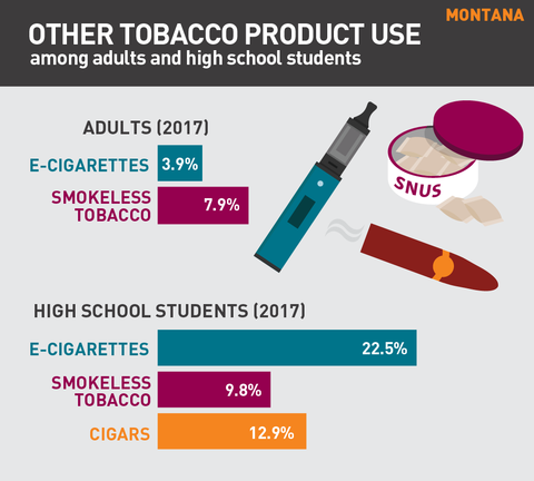 - In 2017, 22.5% of high school students in Montana used electronic vapor products on at least one day in the past 30 days. Nationally, the rate was 13.2%.2