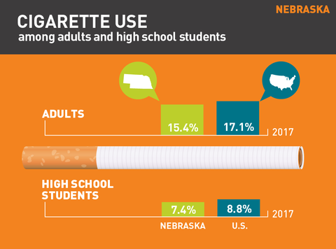 - In 2017, 7.4% of high school students in Nebraska smoked cigarettes on at least one day in the past 30 days. Nationally, the rate was 8.8%.2