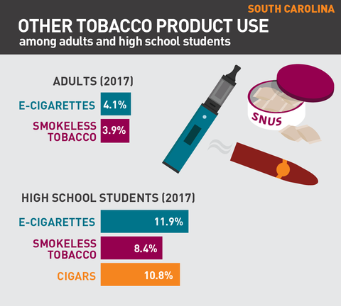 - In 2017, 10.0% of high school students in South Carolina smoked cigarettes on at least one day in the past 30 days. Nationally, the rate was 8.8%.2