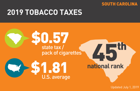 - South Carolina is ranked 45th in the U.S. for its cigarette tax of 57 cents per pack (enacted July 2010), compared to the national average of $1.81. (The District of Columbia has the highest tax at $4.50 and Missouri has the lowest at 17 cents.)6-8