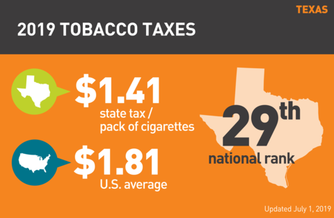 - Texas is ranked 29th in the U.S. for its cigarette tax of $1.41 per pack (enacted January 2007), compared to the national average of $1.81. (The District of Columbia has the highest tax at $4.50 and Missouri has the lowest at 17 cents.)6-8