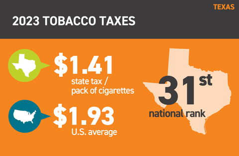 - Texas is ranked 31st in the U.S. for its cigarette tax of $1.41 per pack (enacted January 2007), compared to the national average of $1.93. (New York has the highest tax at $5.35 and Missouri has the lowest at 17 cents.)6-8