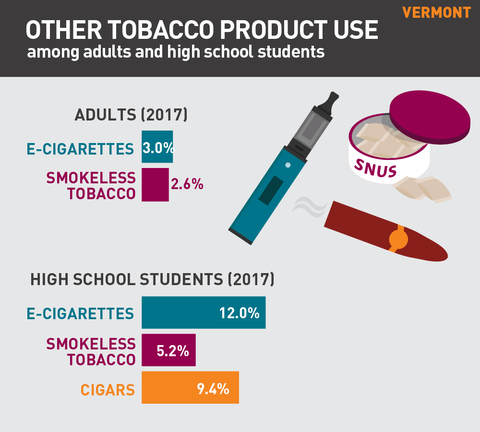 - In 2017, 3.0% of adults in Vermont used e-cigarettes and 2.6% used smokeless tobacco.3
