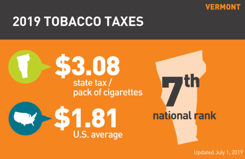 - Vermont is ranked 7th in the U.S. for its cigarette tax of $3.08 per pack (enacted July 2015), compared to the national average of $1.81. (The District of Columbia has the highest tax at $4.50 and Missouri has the lowest at 17 cents.)6-8