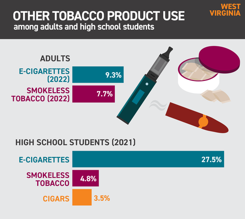 - In 2022, 9.3% of adults in West Virginia used e-cigarettes. Nationally, adult e-cigarette use prevalence was 7.7%.1
