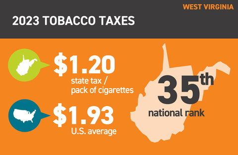 - West Virginia is ranked 35th in the U.S. for its cigarette tax of $1.20 per pack (enacted July 2016), compared to the national average of $1.93. (New York has the highest tax at $5.35 and Missouri has the lowest at 17 cents.)6-8