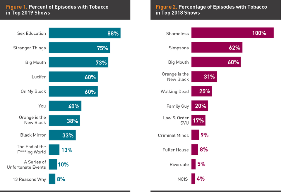 Not only do many shows contain tobacco, but they also feature it repeatedly. Over 50% of 2019 shows that included tobacco depictions featured it in more than half of all episodes. “Shameless” featured tobacco content in every single episode in 2018 and almost all 2019 episodes of “Sex Education” and “Stranger Things” contained tobacco, with 88% and 75% of episodes, respectively, depicting tobacco use.