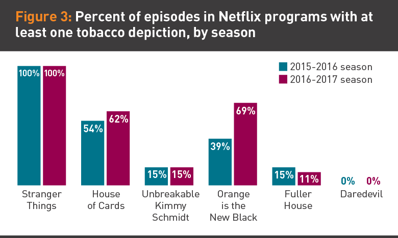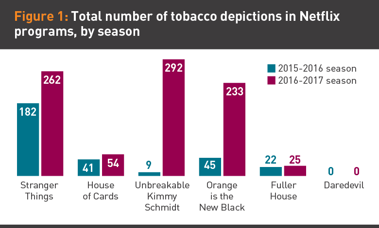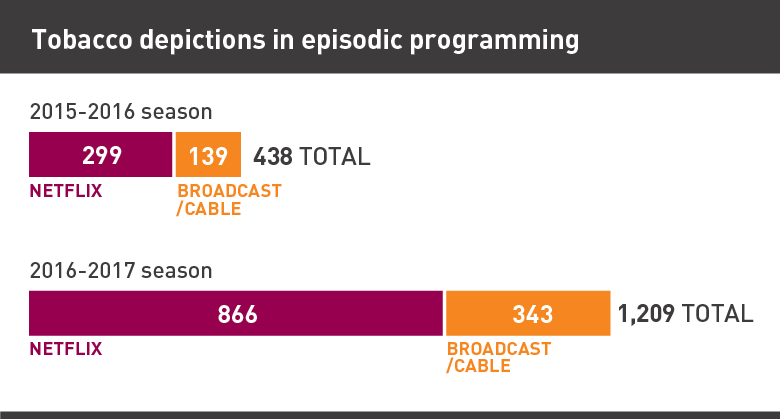Researchers viewed more than 400 episodes and 350 hours of programming to document tobacco depictions. Each image of a cigarette pack or individual product was counted as a separate incident — even if multiple packs or products were shown in the same scene. From the 2015-16 seasons, 210 episodes were coded for the presence of tobacco, including 73 episodes aired on Netflix and 137 episodes aired on broadcast or cable TV. Across all 2016-17 seasons, a total of 206 episodes were coded, including 79 episodes aired on Netflix and 127 episodes aired on broadcast or cable TV.