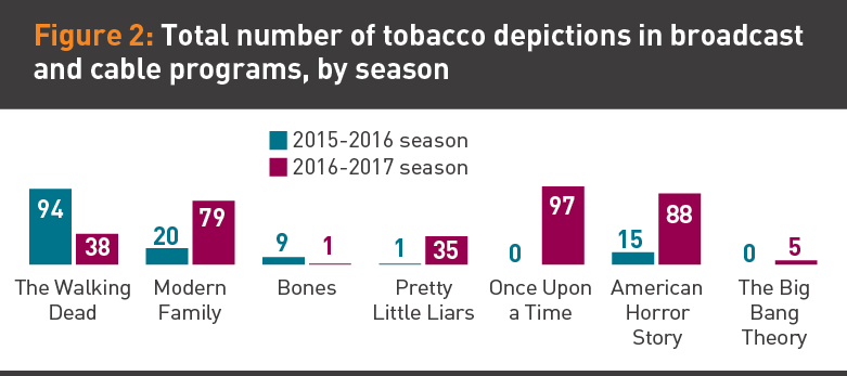 The number of tobacco depictions in the sample of episodic programming aired on broadcast or cable TV increased by close to 150%, or two and a half times, between the two seasons.