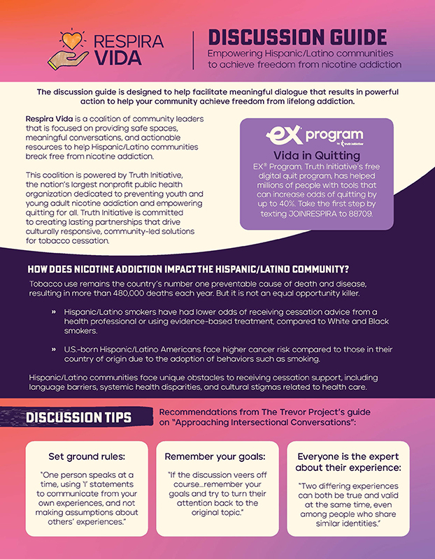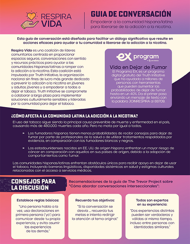 Respira Vida – part of the Culture + Cessation Collective – is a coalition of community leaders dedicated to addressing community-specific challenges facing Hispanic/Latino individuals impacted by tobacco use and nicotine addiction. These communities experience a disproportionate burden from tobacco and nicotine addiction due to a combination of factors, including a history of targeted marketing from the tobacco industry, a lack of culturally competent cessation services, and systemic inequities, from social stressors to historical mistrust of medical institutions.