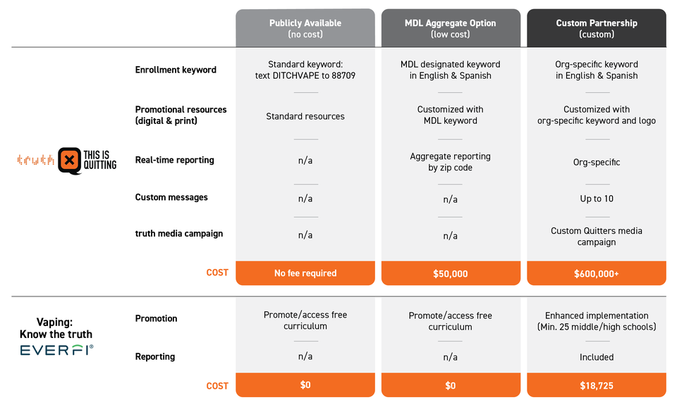 Launched in 2019, This is Quitting is the first-of-its-kind, free quit vaping text message program with over 640,000 young people enrolled, surpassing all quitline programs and other vaping cessation products on the market combined. This is Quitting is the only quit vaping program that has been evaluated in a randomized trial among young adults (JAMA Internal Medicine). Findings from a similar randomized trial among teens will be available in 2024.