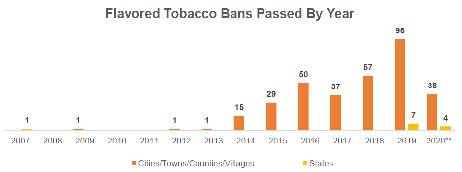 Flavors are also playing a big role in the youth e-cigarette public health crisis — 97% of youth who vape use flavored products — and while the US Food and Drug Administration did issue a policy in January 2020, we believe the policy is deficient and leaves many loopholes. Menthol in all e-cigarette forms and flavors in open-system and disposable products can still remain on the market. Thus, we do not include it here. As a result, implementing strong, local flavor policies that restrict the sale of all flavored tobacco products, including menthol, is an increasingly important tool in ensuring effective tobacco control efforts and protection of the most vulnerable populations.