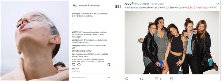 E-cigarettes make frequent appearances on social media newsfeeds and timelines. Most recently, emerging e-cigarette brands, like JUUL, have relied heavily on social media to market and promote their products.