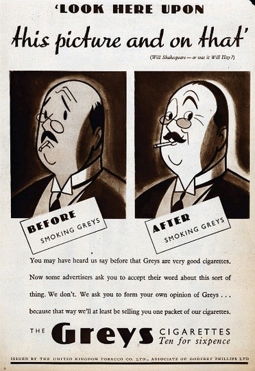 An ad for Greys cigarettes, from 1937, displays two images side by side: the first of a man with a drooping cigarette before smoking Greys, and the other of the same man with a perked-up cigarette after smoking Greys. The sexually suggestive nature of the ad is an early example of a longstanding tobacco advertising strategy.